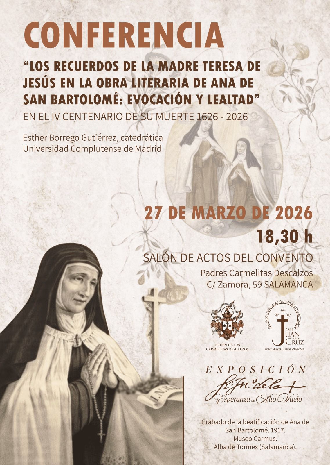 Conferencia de Esther Borrego el viernes 27/03/2026 en el Convento de Carmelitas Descalzos de Salamanca